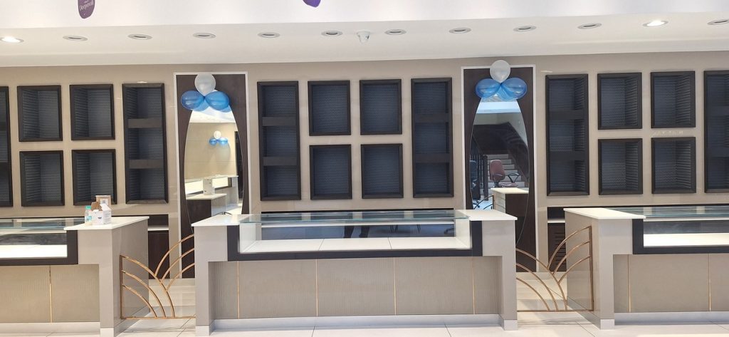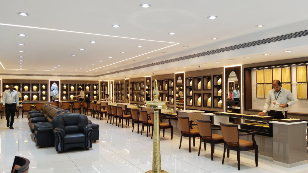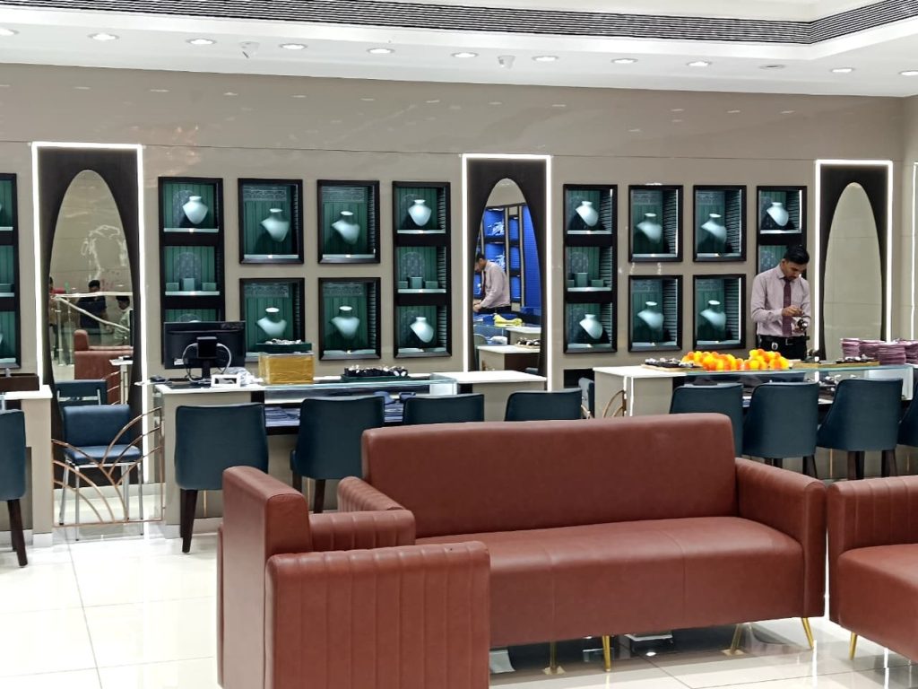 For Kalyan Jewellers, we executed their interior design vision with a meticulous focus on precision, quality, and craftsmanship. Working closely with their design team, we ensured that every element—from spatial planning to the finest detail—was brought to life exactly as they envisioned,ensuring that the final outcome was a true reflection of the brand’s luxurious identity and national stature . Premium-quality materials were sourced and implemented throughout the showroom, including high-grade flooring, custom woodwork, elegant brass finishes, and bespoke lighting fixtures that highlight the brilliance of the jewellery collections. The display counters were tailored with anti-reflective glass and integrated lighting systems to enhance the visual appeal of each jewellery piece, while ergonomic layouts ensured comfort for both customers and staff. The result is a flawless execution of their concept—timely, refined, and perfectly aligned with Kalyan’s commitment to excellence and luxury.